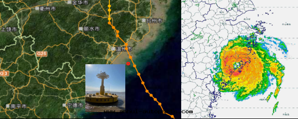 图(tú)3:華航漂浮式激光雷(léi)达(dá)安(ān)裝(zhuāng)位(wèi)置示意(yì)图(tú)(左)與(yǔ)台(tái)風(fēng)强度(dù)天气(qì)雷(léi)达(dá)图(tú)(右(yòu))